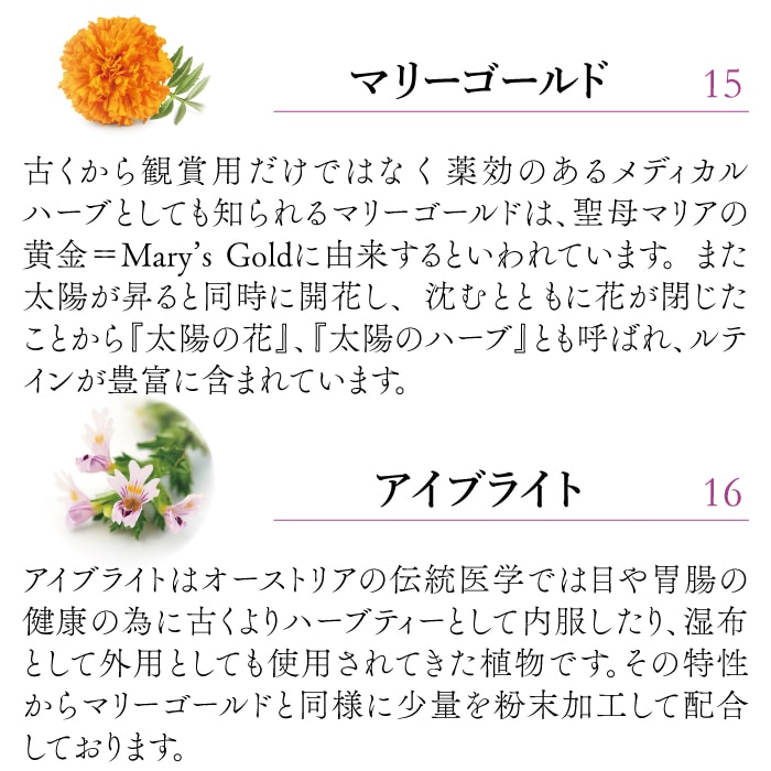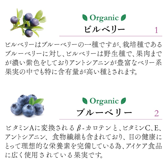 全体の30%以上をベリー系、50%以上をアントシアニン含有原料を使用し、その他には目の健康に重要な栄養素を含む原料にて構成しています。
