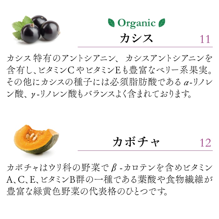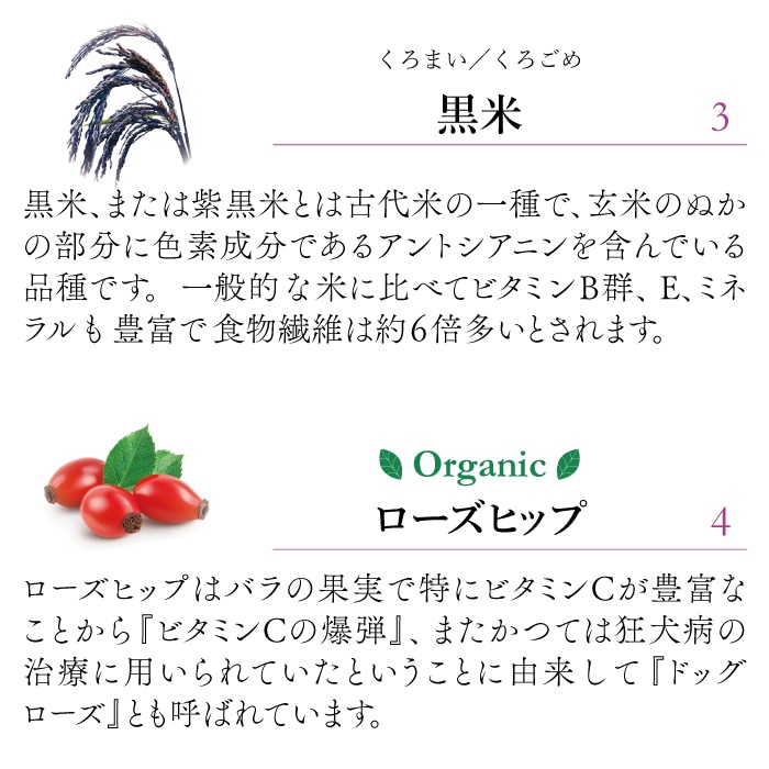ビルベリー、ブルーベリー、黒米、ローズヒップ、赤米、紫芋、トレハロース、亜麻仁、フィッシュコラーゲン、難消化性デキストリン、カシス、カボチャ、人参、人参の葉、マリーゴールド、アイブライト